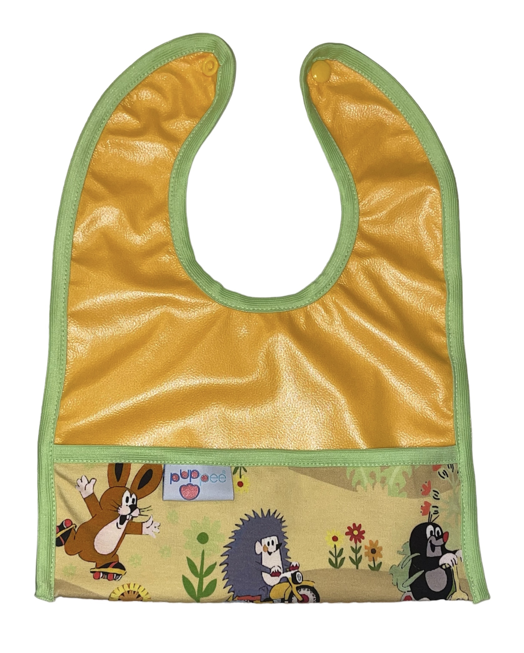 Ha Te is szeretnéd elkerülni az étkezések utáni állandó ruhacsérét, próbáld ki előkénket! Gyermeked vállára simul, míg elől a praktikus zsebnek köszönhetően felfogja a leeső ételdarabokat. Számtalan minta közül válogathatsz, hogy biztosan szívesen felvegye. Belül pul, így használat után könnyen kitörölhető. Hátoldala egyszínű pamutvászon. Nyakban patenttal záródik.