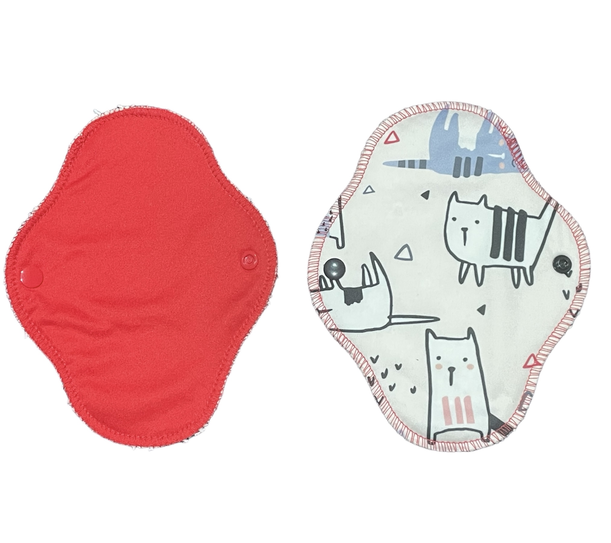 Vékony, de nagy nedvszívó-képességű menstruációs betétek: a test felől egyszínű szárazontartó, hogy ne érezd a nedvességet, és minden foltot könnyedén ki tudj mosni; középen egy réteg 100% biopamut zorb; alul nedvességzáró (mintás vagy egyszínű) pul réteg. 19,5 cm hosszú, és 5,5 cm széles összepatentolva.